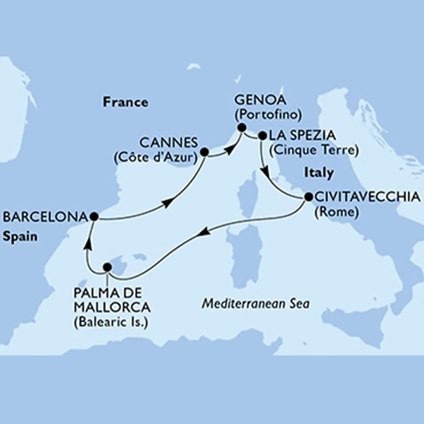 🛳️ Средиземноморский Круиз открывает двери в яркие города Южной Европы: элегантные Канны (Франция), историческая Генуя и живописная Специя (Италия), Чивитавеккья — удобные ворота к сокровищам Рима, солнечная Пальма‑де‑Майорка (Испания) и энергичная Барселона.