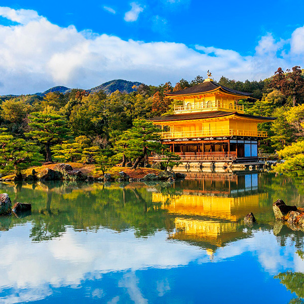 Это главный буддийский храм, основа дзен-буддизма, в котором содержатся мощи Будды, покрытые золотым листом. Крыша золотого храма также покрыта тончайшим золотым листом. Рядом с храмом растёт сосна, которой несколько поколений садовников придают форму плывущего корабля.
